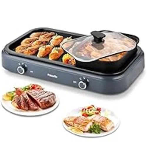 【RAPID HEATING & CONSTANT TEMPERATURE】The indoor smokeless grill for kitchen comes with a large Non-Stick grilling plate 16 x 9 inch, making it great for parties and family fun with delicious food. With 1500 watts power smokeless indoor grill effortlessly melts cheese, cook up meats, veggies and seafood just in minutes